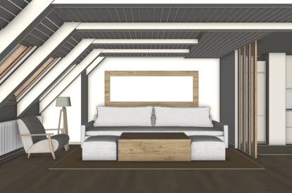 Y una última planta, con techo abuhardillado de madera en forma de cabaña, una pequeña zona de estar y baño completo.